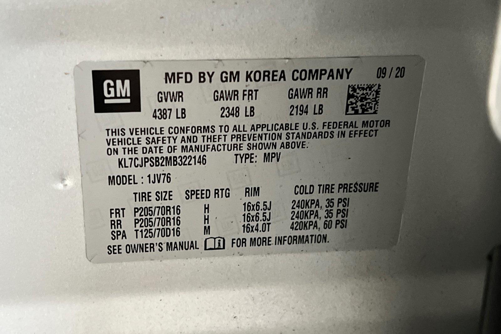 Silver Ice Metallic 2021 Chevrolet Trax LT AWD. Powered with a 6-Speed Automatic and ECOTEC Turbo 1.4L Engine. Equipped 16"" Aluminum Wheels, 2 USB Ports w/Auxiliary Input Jack, Apple CarPlay/Android Auto, OnStar and Chevrolet connected services capable, Chevrolet MyLink, Rear Parking Camera, Roof rack: rails only, and Spoiler.