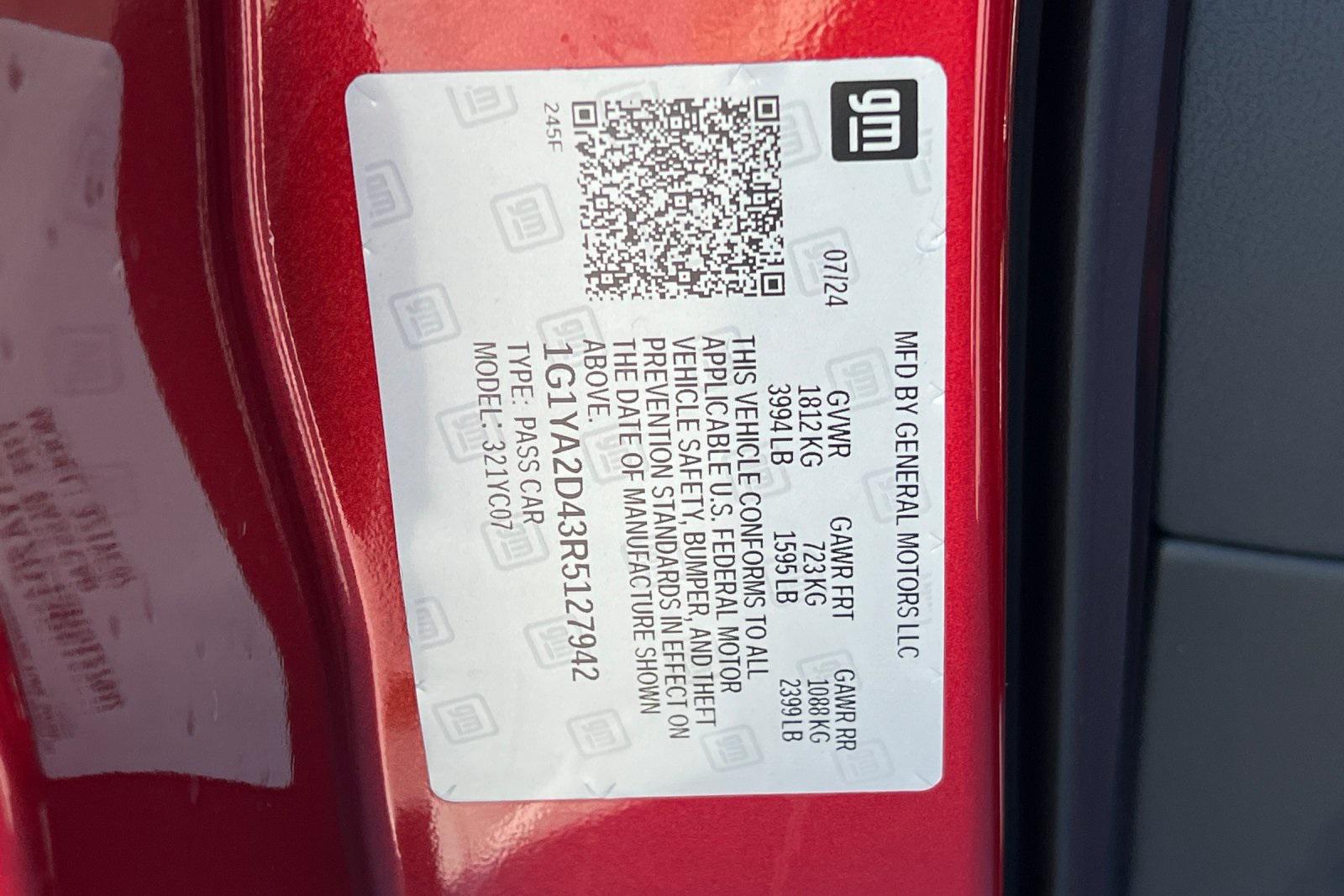 CARFAX One-Owner. Clean CARFAX. Red Mist Metallic Tintcoat 2024 Chevrolet Corvette Stingray 1LT. Powered by a 8-Speed Dual Clutch and 6.2L V8 Engine. Equipped with 8-Way Power Driver Seat Adjuster, 8-Way Power Passenger Seat Adjuster, Edge Red-Painted Calipers, OnStar and Chevrolet connected services capable, Engine Lighting, GT1 Bucket Seats, Mulan Lthr Seating Surfaces w/Perforated Inserts, Navigation System, and Performance Exhaust w/Stainless-Steel Tips.Recent Arrival! Odometer is 7731 miles below market average!